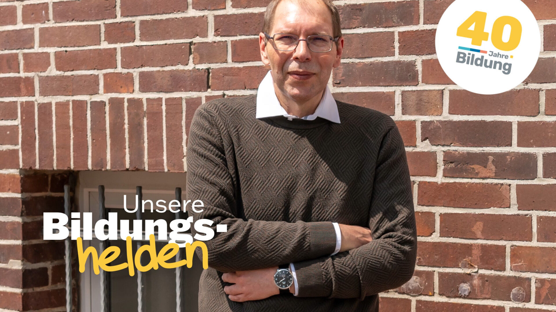 Der erfolgreiche Umschüler André Pardun steht mit verschränkten Armen vor einer geziegelten Hauswand.