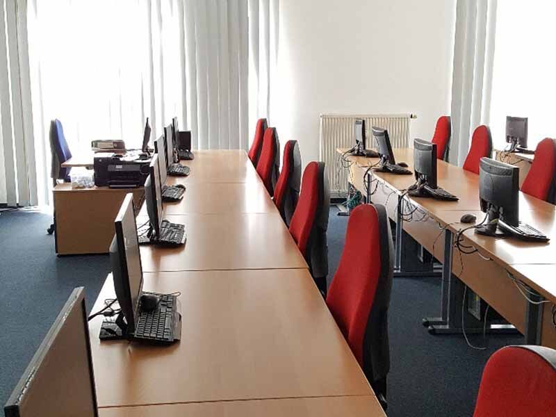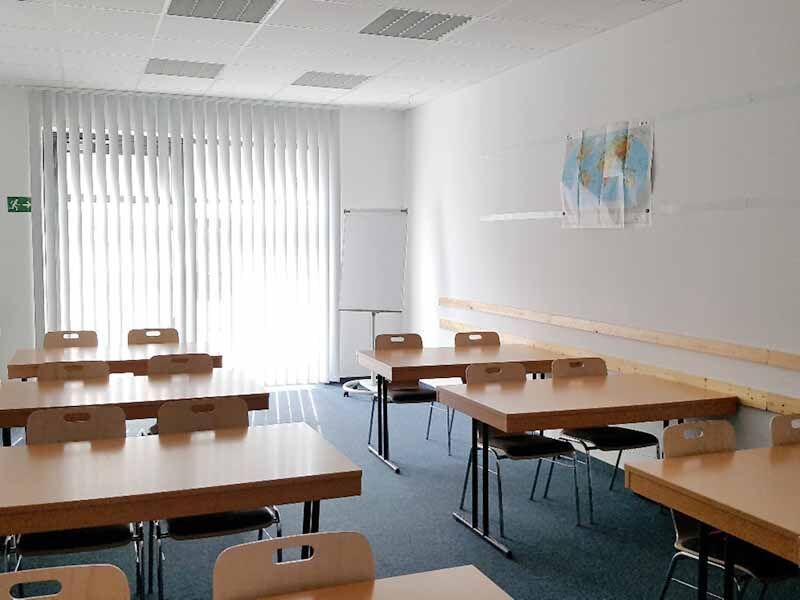 Das große Gebäude in der Lederergasse 2 stammt aus den 90ern und beherbergt sowohl gewerbliche als auch private Mieter. Großer Vorteil: Auch die Agentur für Arbeit befindet sich im gleichen Haus. Die Schulungsräume im Erdgeschoss bieten mit großen Fensterfronten und Teppichboden eine angenehme Arbeitsatmosphäre. Ihre Unterrichtszeit liegt zwischen 8 und 16:15 Uhr. Der Pausenraum verfügt über Tische und Stühle zum Essen, Kaffee- und Kaltgetränkeautomat zur Stärkung sowie drei Sofas zum Entspannen.
