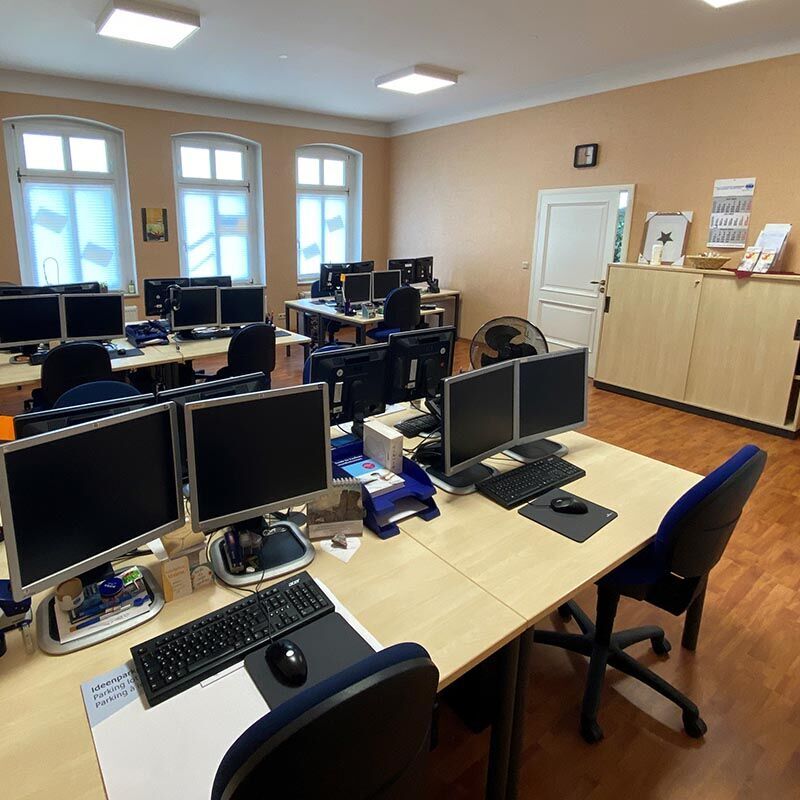 Willkommen im historischen Altbau, der innen die moderne Ausstattung mit einer gewissen Gemütlichkeit vereint. Zum Beispiel sorgen farbige Wände, Bilder und Grünpflanzen für Wohlfühl-Atmosphäre. Sie brauchen mal eine Pause vom Lernen? Ein separater Aufenthaltsraum sowie eine gut ausgestattete Küche bieten Ihnen die Möglichkeit zur Entspannung und Stärkung.