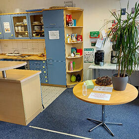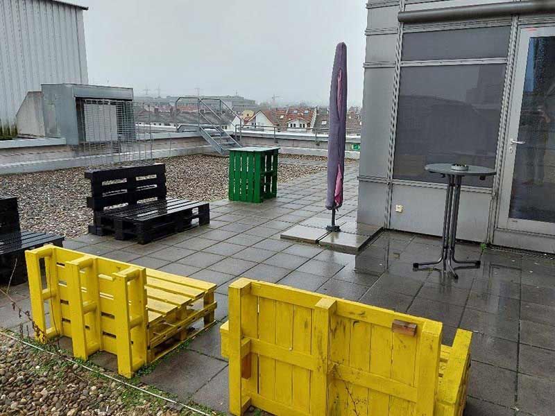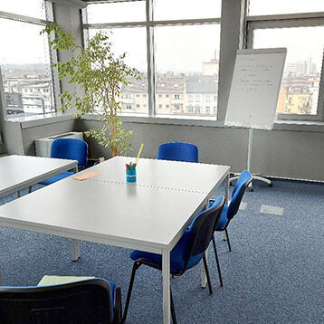 Der Aufzug bringt Sie in den vierten Stock, wo Sie der Eingangsbereich mit kleiner Sitzecke begrüßt. In den Schulungsräumen herrscht eine angenehme, ruhige Arbeitsatmosphäre. Durch die großen Fenster kommt viel Licht herein; bei Bedarf können sie aber auch mit elektrischen Jalousien variabel abgedunkelt werden. Sie brauchen mal eine Pause? Dann schnappen Sie etwas Luft auf der Dachterrasse oder stärken Sie sich im Pausenraum.