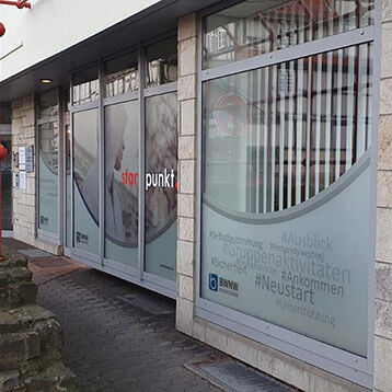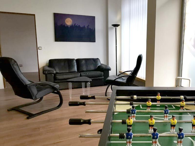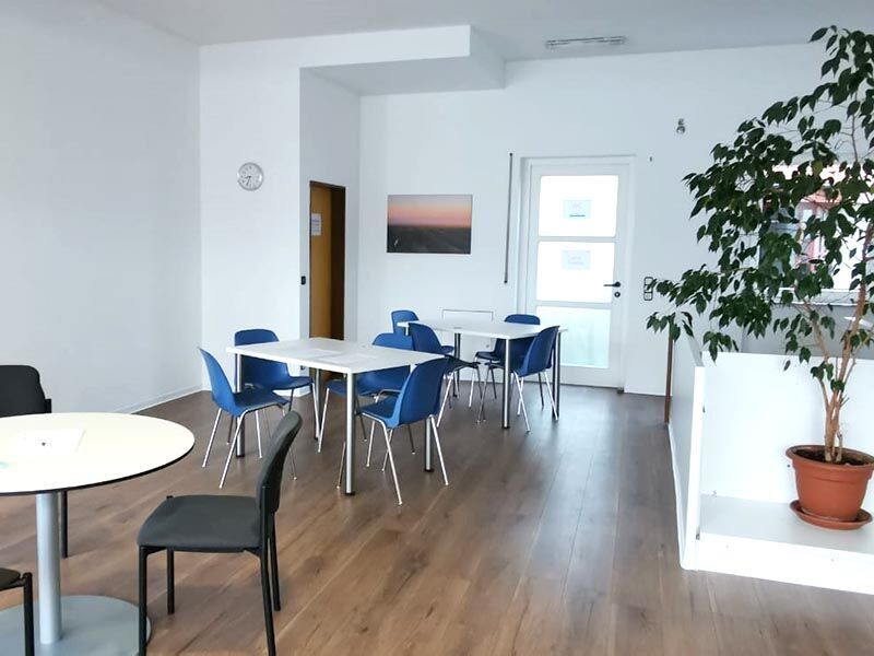 Ihre Schulungsräume begrüßen Sie im Erdgeschoss. Für eine angenehme Lernatmosphäre sorgen die schöne Renovierung mit freundlichem Anstrich sowie die dekorativen Bilder und Grünpflanzen. Ihr Unterricht findet hier zwischen 8 und 16:15 Uhr statt. Teilnehmer können aber auch einfach so zu den Öffnungszeiten kommen – zum Beispiel, um eine Runde zu kickern, Musik zu hören oder sich auszutauschen. Der Standort ist auch mit einer Dusche und Waschmaschine ausgestattet.